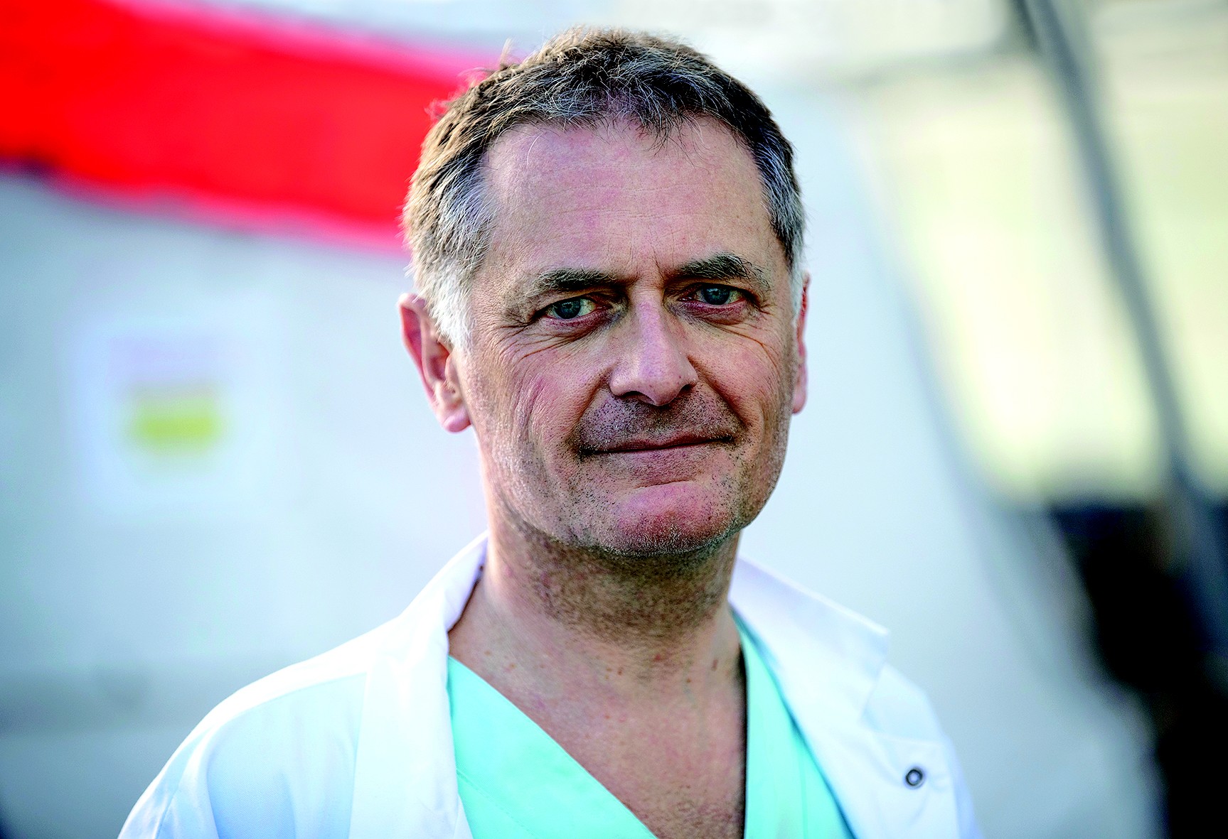 Doctor Philippe Juvin, chief of the Emergency room of the Georges Pompidou Hospital in Paris poses on March 25, 2020 in front of a tent set up to sort patients in the courtyard of the hospital. – (Photo by Thomas SAMSON / AFP)